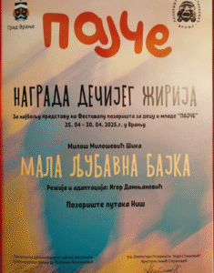 На Првом фестивалу позоришта за децу и младе у Врању, наша представа „Мала љубавна бајка“ освојила је награду за најбољу представу, уједно и једину награду овог фестивала!